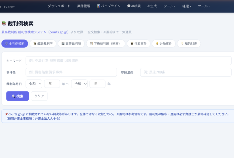 複雑な操作は一切なし。資料請求なし・無料 / 10秒で始める法律事務所向けAI DX。 訴訟文書・交渉文書の作成からAI相談、事件分析、依頼者ポータル、ファクトチェック、mints電子提出まで—— 小規模事務所に大手並みのAI法務基盤を。 (顧問弁護士事務所:弁護士法人えそら)