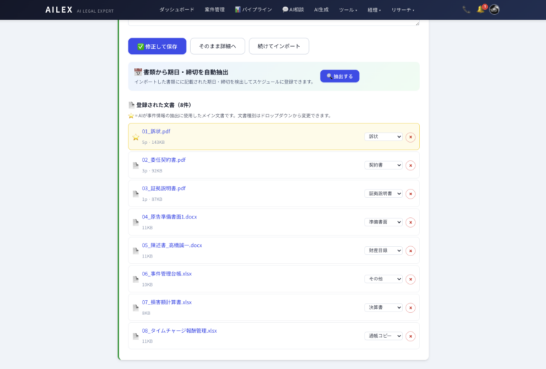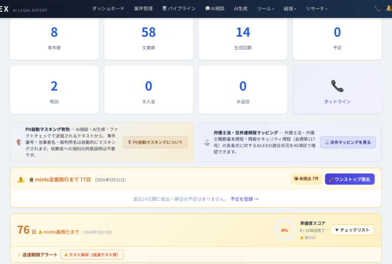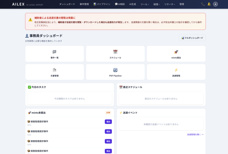 AILEXは、mintsへの提出準備から送達後の期限管理まで、 電子訴訟の実務をワンストップで支援します。