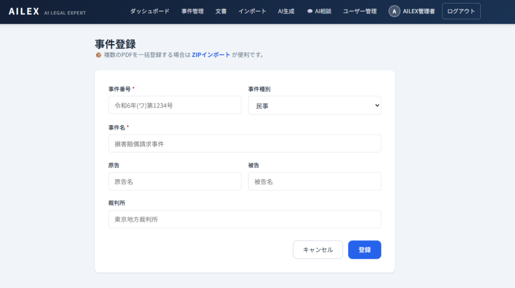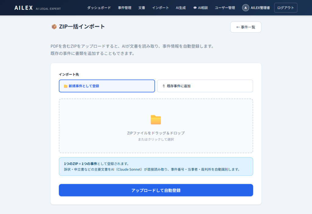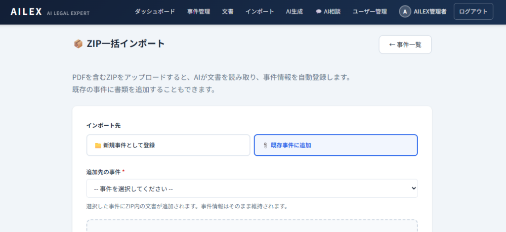 すでに訴状・答弁書・証拠などのPDFファイルが手元にある場合は、ZIPインポート機能/import)を使って事件と文書を一括登録できます。PDFの内容をAI-OCRが自動解析し、事件番号・事件名・当事者名・裁判所を自動抽出してくれます。