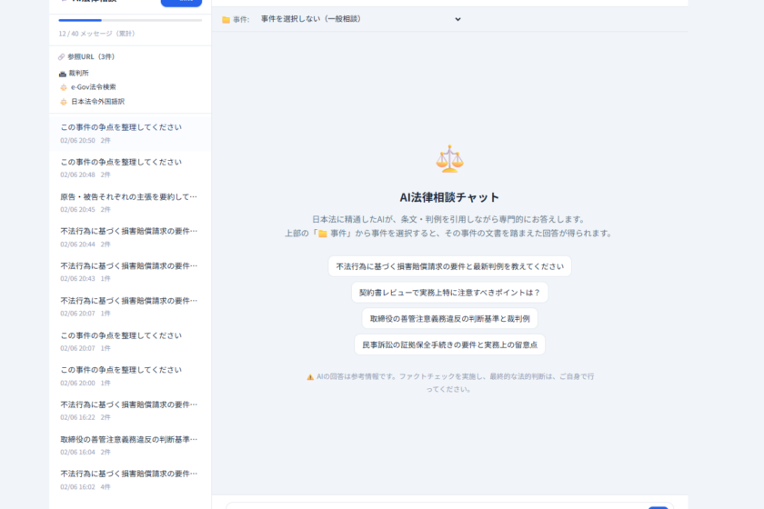 このモードでは、事件の基本情報(事件番号、当事者、裁判所、種別、ステータス)と登録済み文書の内容がAIのシステムプロンプトに自動注入されます。これにより、AIが事件の文脈を理解した上で回答を生成するため、一般的な法律質問よりもはるかに的確なアドバイスが得られます。