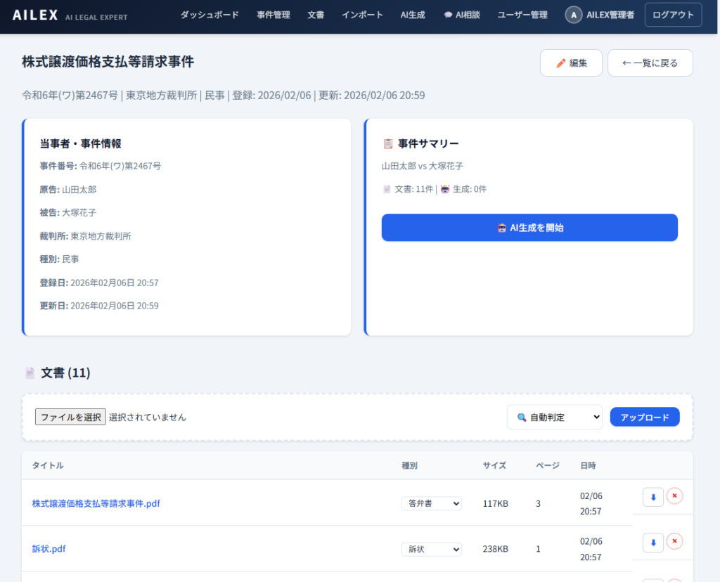 AILEXでは 「事件」がすべての情報のハブ になります。事件を登録すると、その事件に対して文書をアップロードしたり、AIで準備書面や内容証明を生成したり、AIチャットで事件固有の法律相談を行ったりできます。