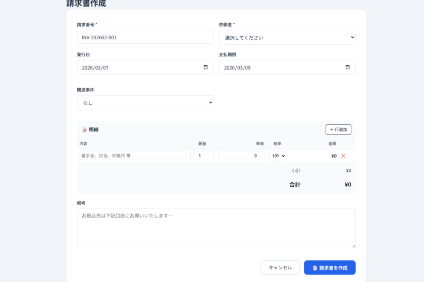 • 依頼者 — 事件に紐づく依頼者が自動でセットされます