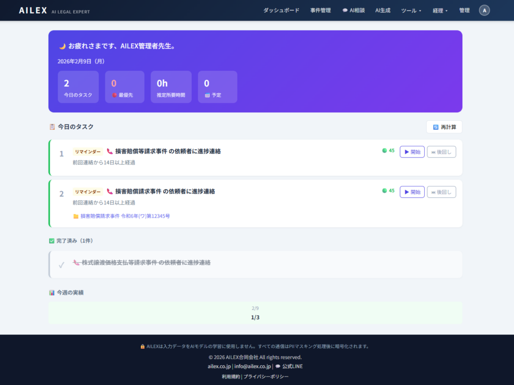 AILEXのタスク管理は、訴訟実務に特化した設計です。