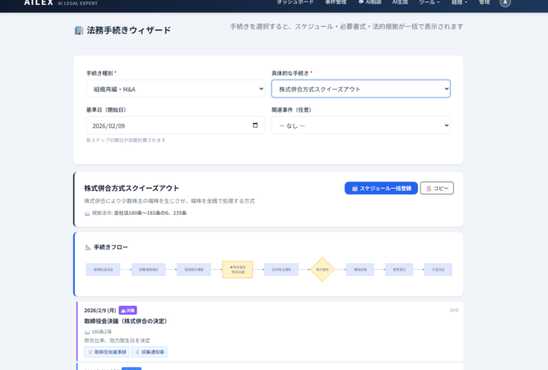 4. 【新機能追加】「法務手続きウィザード」— 企業法務の手続きフロー・必要書式・期日を一括表示