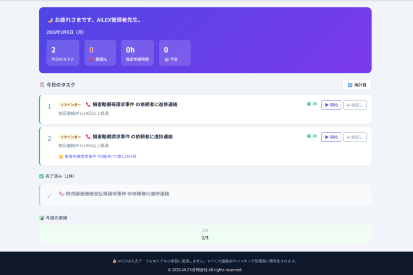 AIによる優先度スコアリングは、登録されたタスク・スケジュール・事件情報に基づく参考情報です。表示される優先順位は、弁護士ご自身の判断を補助することを目的としており、法的助言や業務指示を行うものではありません。タスクの最終的な優先順位の判断は、弁護士ご自身の責任で行ってください。