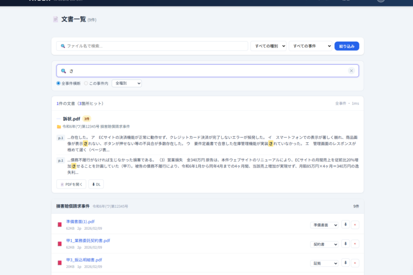 AILEXは今回のアップデートで、文書内テキスト検索(ファイル内検索)システムを追加しました。事件に紐づくすべてのPDF文書を、キーワード一つで横断的に検索できる機能です。