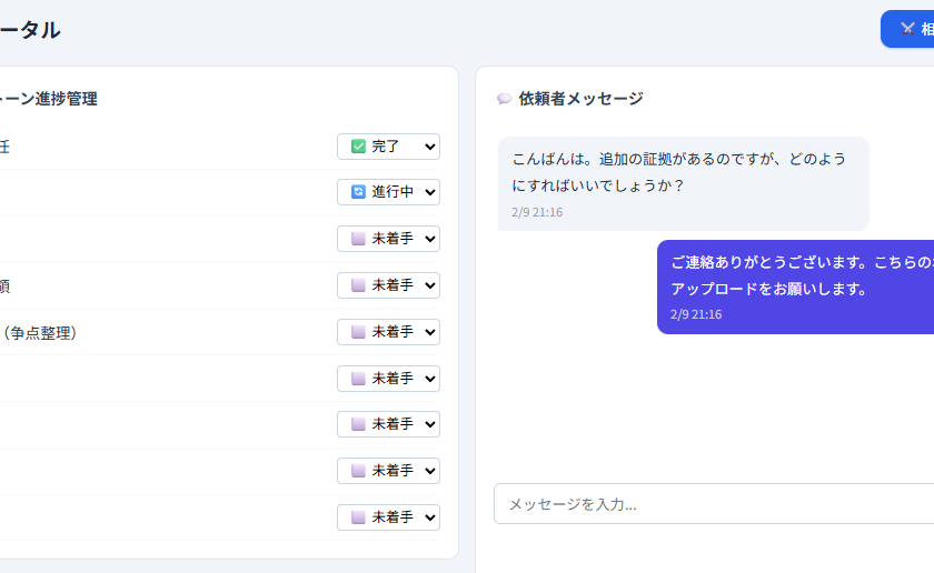 弁護士と依頼者の間で、ポータル上でメッセージを送受信できます。メールや電話ではなく、事件に紐づいた専用の通信手段として機能します。