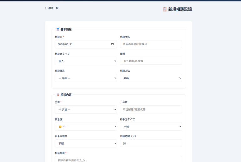 法律相談カルテ(T99改修版): → 「🏛️ 事務所運営」タブ → 法律相談カルテ → 下部に⚠マーク付きチェックリストが表示されます