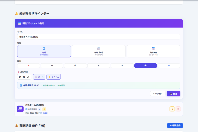 — 委任契約の報告頻度に連動した自動通知で、依頼者トラブルを未然に防ぐ —