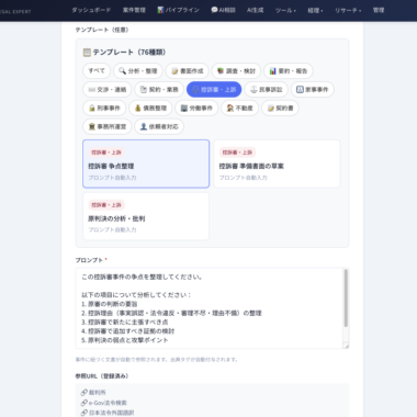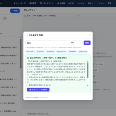 AI生成結果の法的根拠を外部ソースと照合して検証するファクトチェック機能に加え、e-Gov法令APIとの深層統合により、条文の自動引用や引用精度の検証も行えます。「AIが生成した書面に引用された条文は本当に存在するか」を技術的に検証できる仕組みです。
