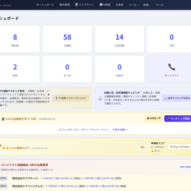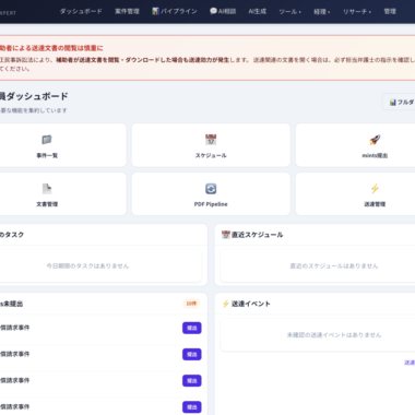 送達管理ダッシュボードでは、mintsのシステム送達における閲覧期限、DL期限、みなし送達日を自動計算し、カレンダー連携で期限管理を行います。紙→PDF自動変換パイプラインは、スキャンしたPDFをmints要件に準拠した形式に自動変換します。mints準備度スコアは、2026年5月21日の義務化に向けた事務所の準備状況を可視化します。