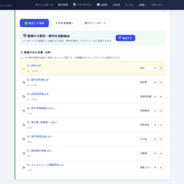 AILEXには20種類のAIエージェントツールが搭載されています。事件検索、文書分析、スケジュール管理、コンフリクトチェック、セマンティックサーチなど、弁護士業務のあらゆる場面で自然言語による対話型の支援を受けることができます。