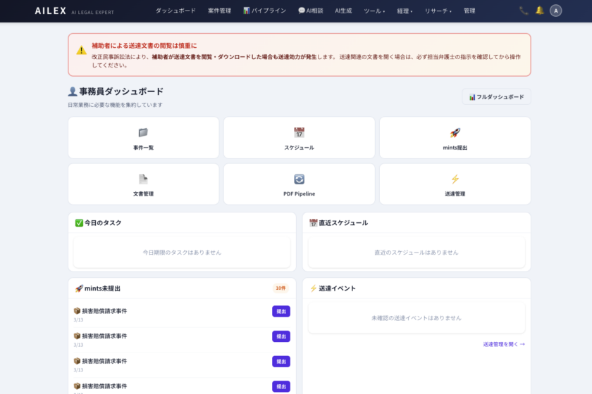 AILEX合同会社(本社:東京都渋谷区、代表:上村 十勝、顧問弁護士事務所:弁護士法人えそら)は、同社が開発・提供するAI法務支援クラウドSaaS「AILEX(エーアイレックス)」において、事務員アカウントの権限を拡充し、事件情報の編集を可能にするアップデートを実施したことをお知らせいたします。